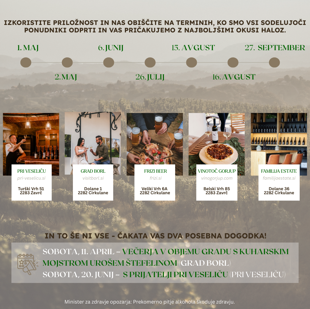 HalozeKulinarična avantura Haloze je projekt, ki združuje ljubitelje dobre hrane, kakovostnih pijač in avtentičnih doživetij. Preko projekta odpiramo vrata petih izbranih ponudnikov – Pri Veseliči, Grad Borl, Frizi Beer, Vinotoč Gorjup in Familija Estate – ki vas bodo razvajali s svojimi specialitetami ter vas popeljali skozi zgodbo vina, piva in kulinarike tega čarobnega območja.