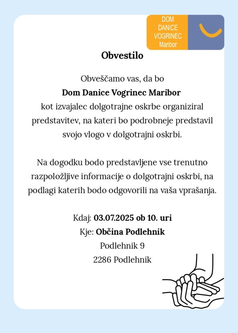 Dom Danice Vogrinec Maribor kot potencialni izvajalec storitve dolgotrajne oskrbe v Občini Podlehnik vabi vse občanke in občane na