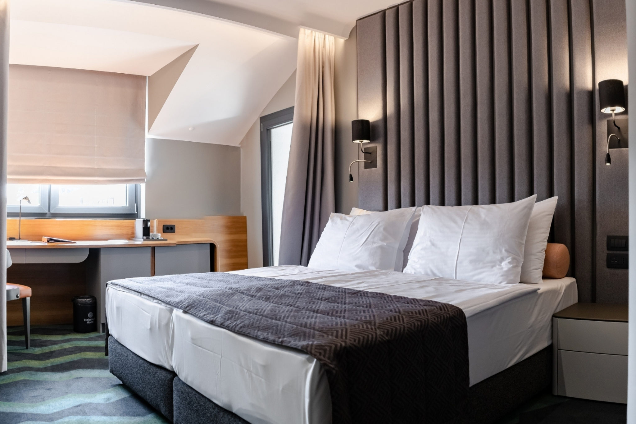 Hotel ponuja prostorne zasnovane sobe in apartmaje različnih kategorij, vključno s prestižno predsedniško suito. Vse sobe so sodobno opremljene in vključujejo klimatsko napravo, minibar, sef, brezplačen Wi-Fi in TV z ravnim zaslonom. Izbran tip sob nudi tudi balkon z razgledom na gozdove Pohorja ali mesto Maribor.